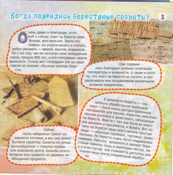 С тех пор прошло 800 лет. Его «тетрадки» нашли археологи. Только вот «тетрадки» эти на наши совсем не похожи: обычные кусочки бересты.