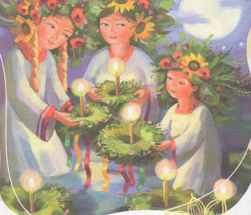 Влюблённые прыгают через костёр, а молодые девушки плетут венки и бросают их в реку, загадывая желание.