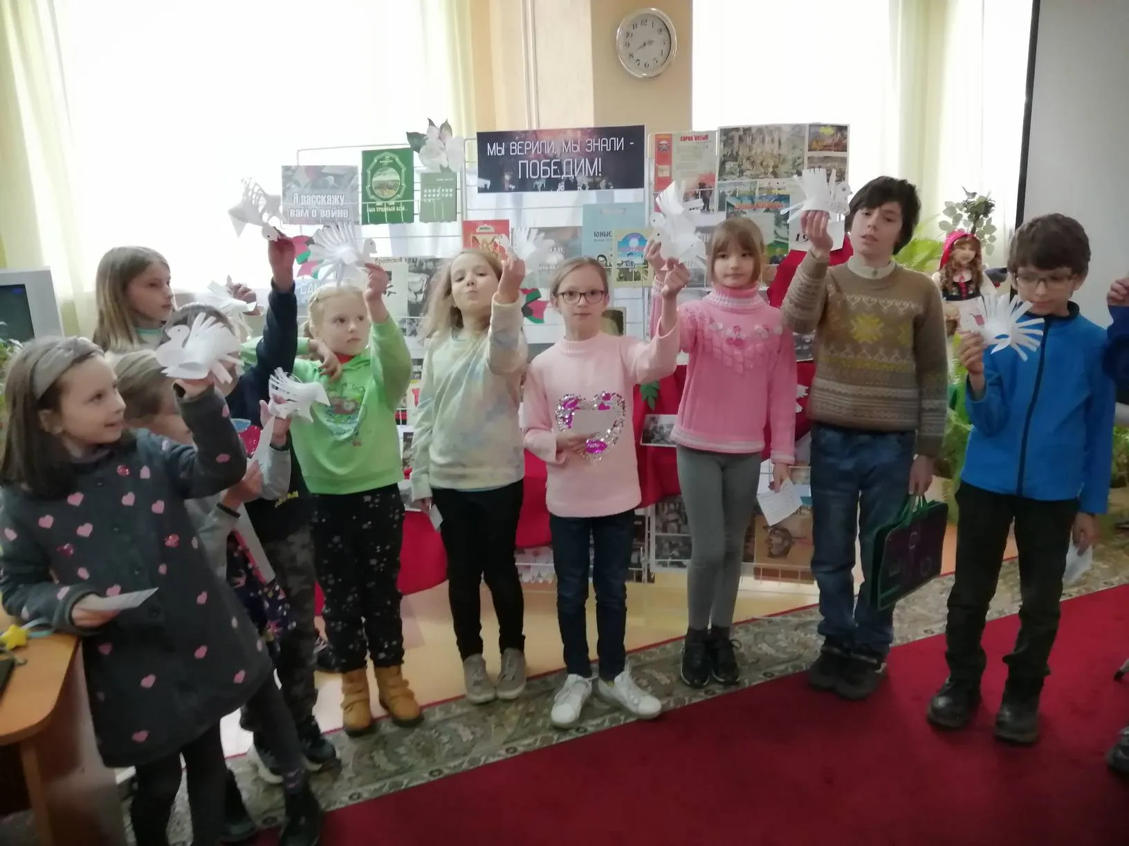 Поддерживая традицию выпускать белых голубей, как символ мирных намерений, участники любительского объединения «Почемучки» все вместе сделали красивых бумажных птичек и украсили ими книжную выставку-память «Мы верили, мы знали – победим!», посвященную Дню Победы в Великой Отечественной войне.