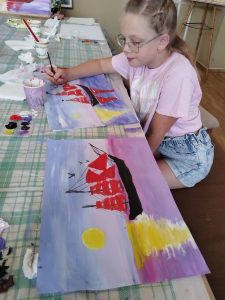 Под руководством волонтёра Алеси Борисюк ребята освоили технику изображения корабля с алыми парусами. Вдохновлённые рассказом Алеси о повести-феерии А. Грина, участники мастер-класса вместе руководителем погрузились в волшебный мир творчества.
