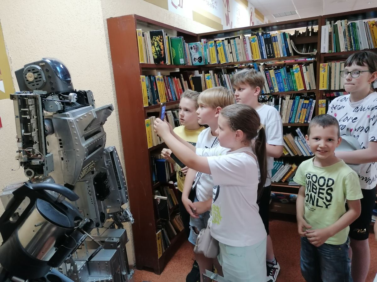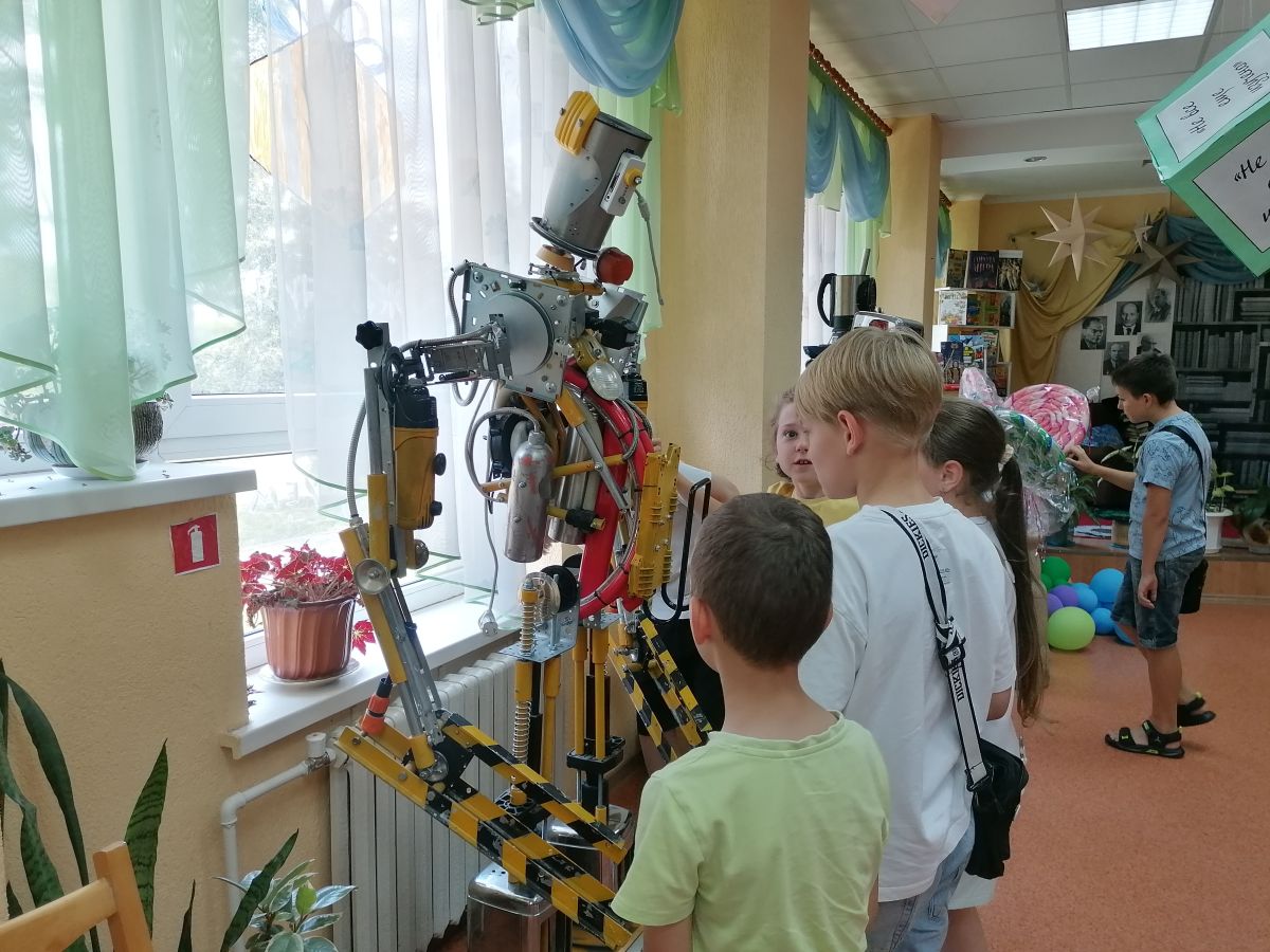 Удивление и восторг вызвала команда железных роботов Александра Годуна, которая поселилась в зале отраслевой литературы. Все стремились лично поприветствовать электроников за руку-манипулятор или помахать ему перед лицом-дисплеем. В окружении команды железных роботов, ребята смогли сразиться в литературно-интеллектуальной блиц-игре «Сказочный алфавит”.