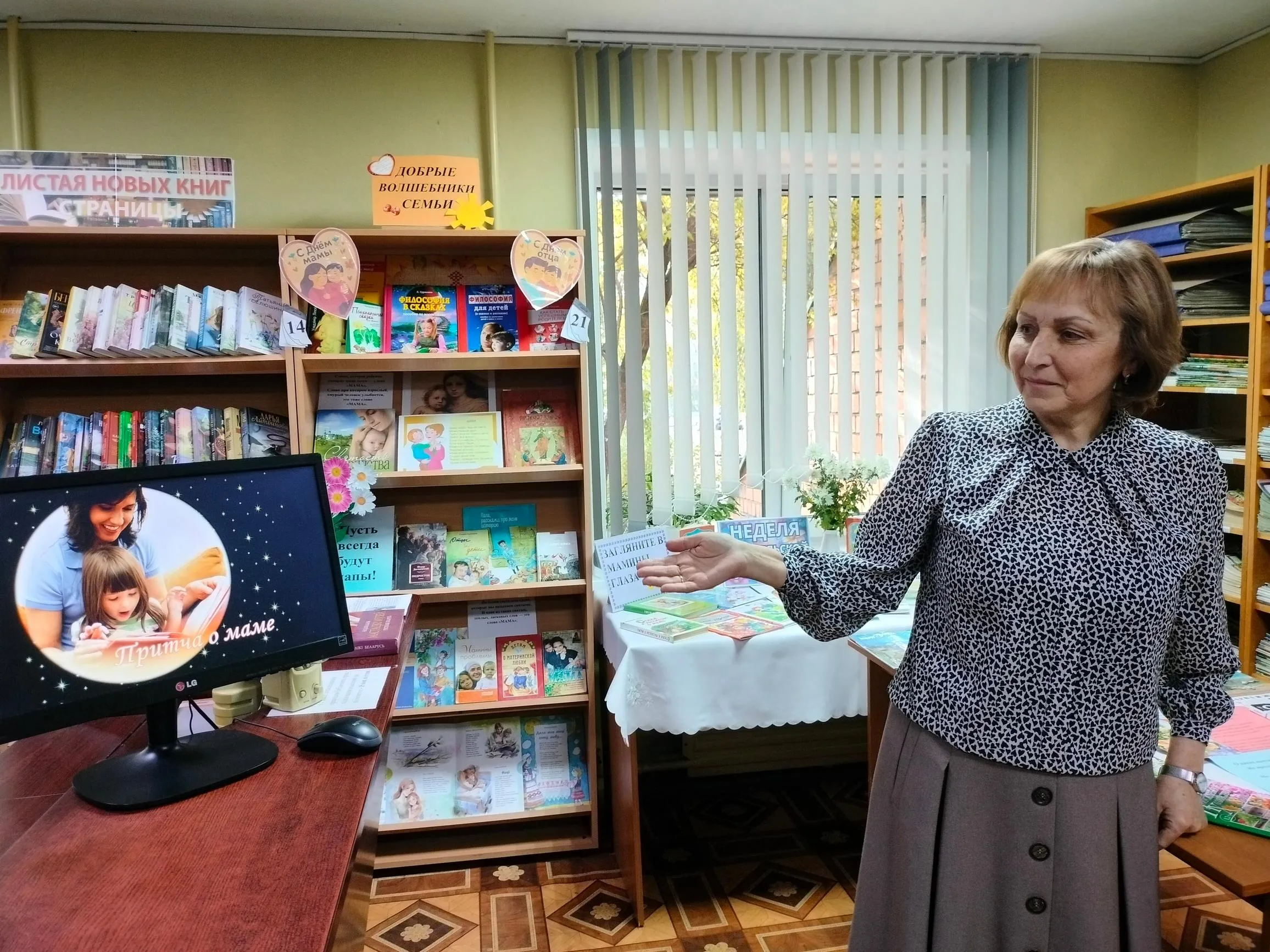 Встреча с юными читателями началась с просмотра видеоролика «Притча о маме». Презентация «Самая прекрасная из женщин» дала начало беседе о праздновании Дня матери, история которого уходит корнями в религиозный праздник – Покров Пресвятой Богородицы.