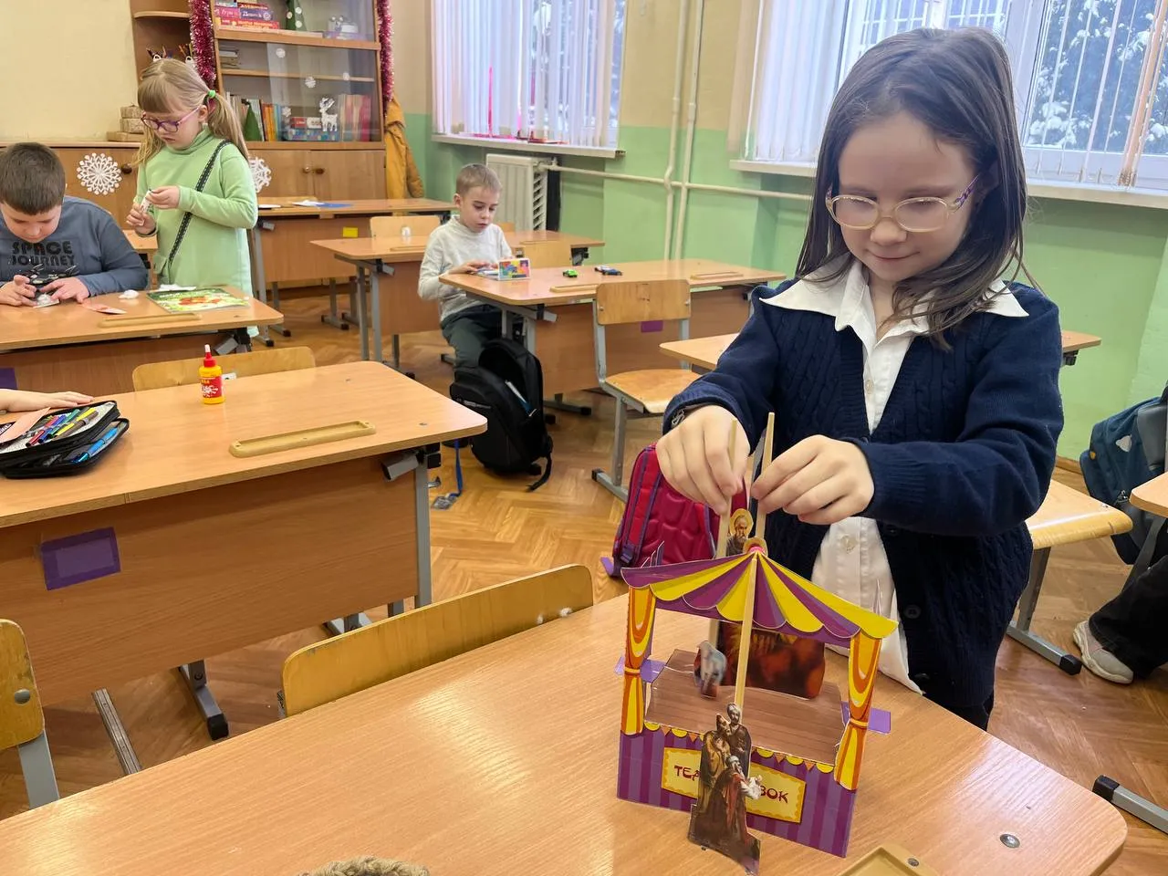 После увлекательного творческого процесса работники библиотеки развернули вертеп – миниатюрную сцену, воссоздающую события Рождественской ночи. Они поведали ребятам трогательную историю рождения Иисуса Христа, а затем предложили самим поучаствовать в праздничной рождественской постановке.