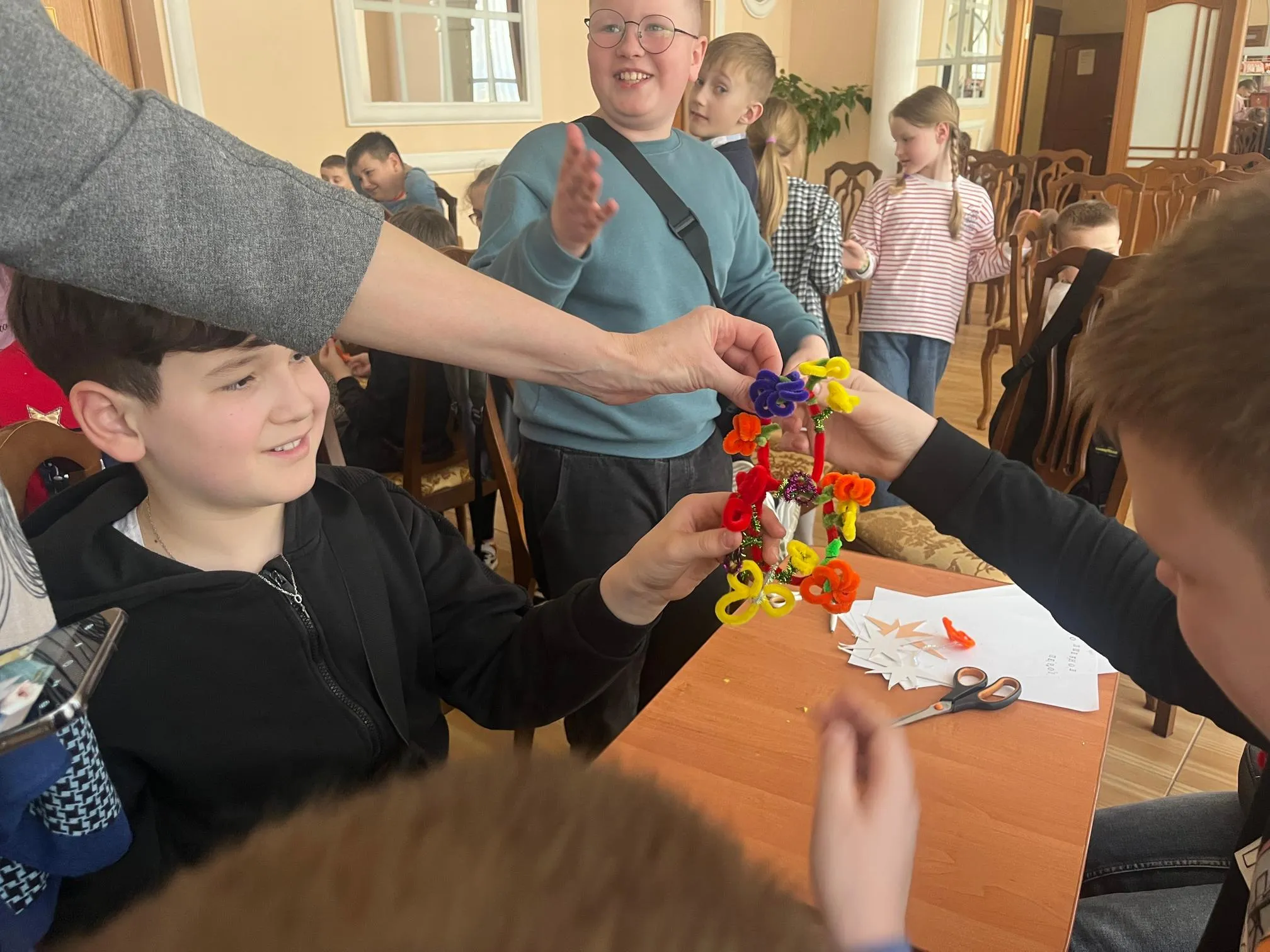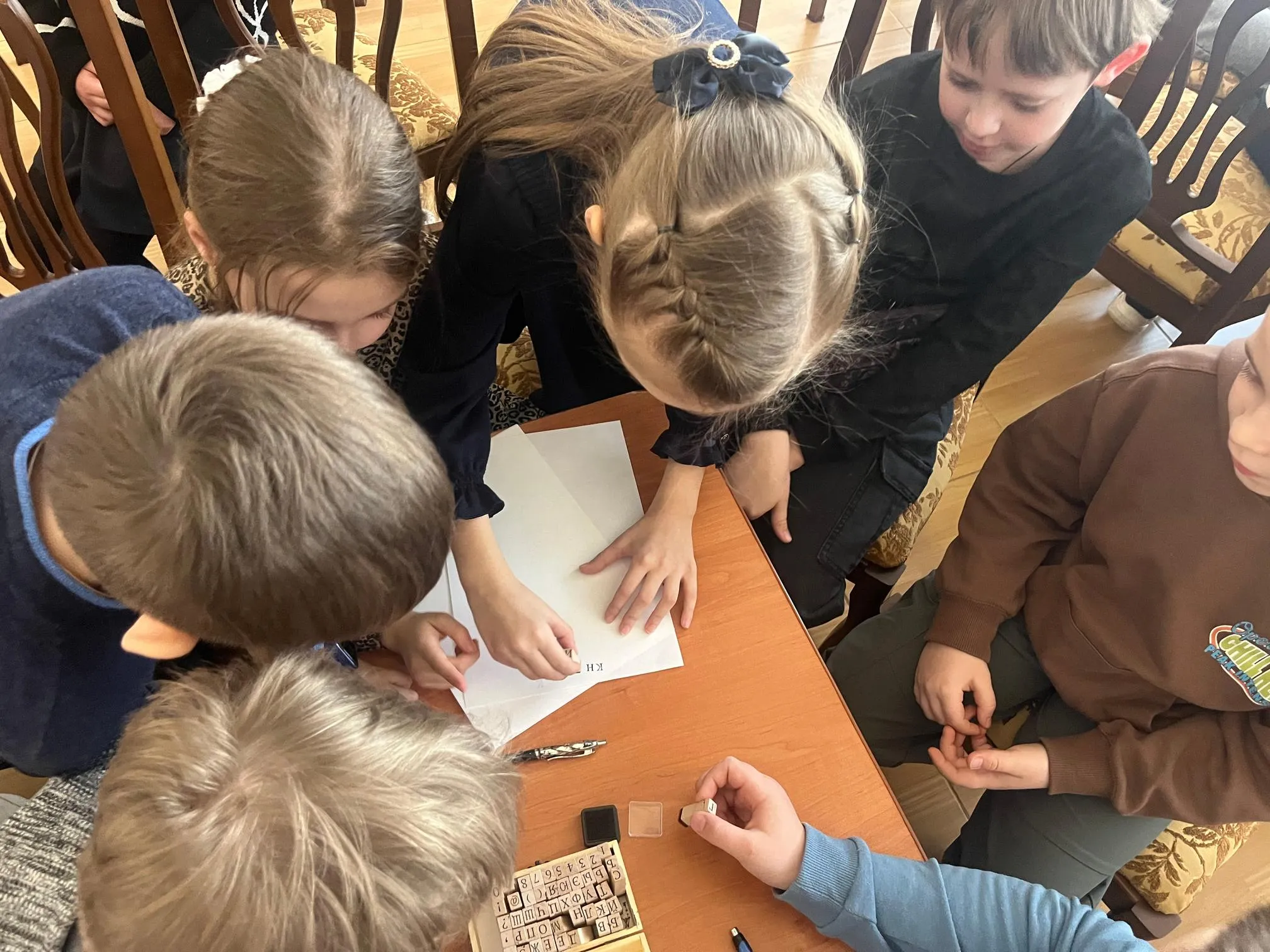Дети приняли участие в интерактивной викторине по истории создания книги, проследив путь от древних свитков до современных изданий. Попробовали себя в роли наборщиков и, поделившись на группы, самостоятельно «отпечатали» названия своих команд. Используя синельную проволоку, дети создали объемные, пушистые и невероятно красивые заглавные буквы, с которых начинались главы в старинных фолиантах. Научились ремонту книг.