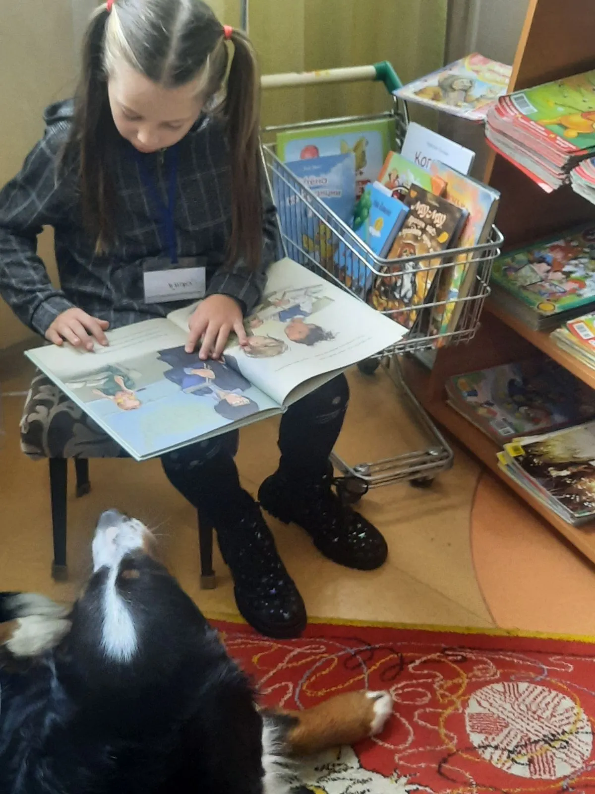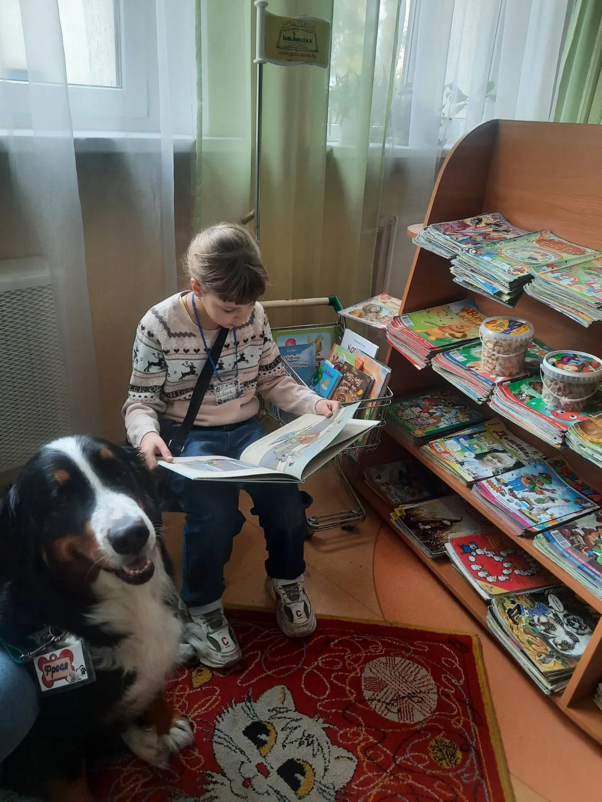 За время работы кружка, библиотеку посетило большое количество лохматых слушателей. Это и джек-рассел-терьер Джеки, и немецкая овчарка Бьёрн, и йорк Рич, и бернский зенненхунд Берта. Сегодня активным слушателем сказок является зенненхунд Фрося.