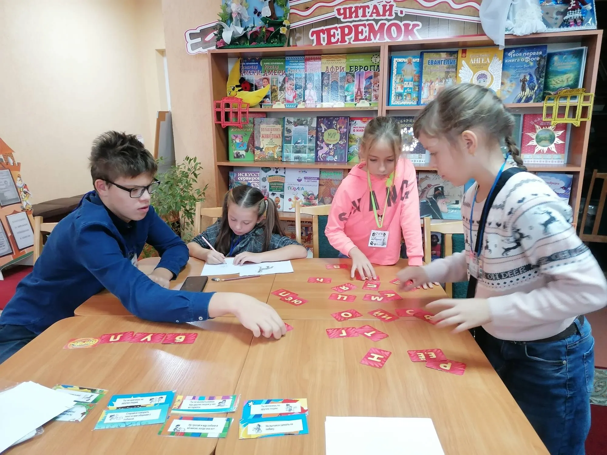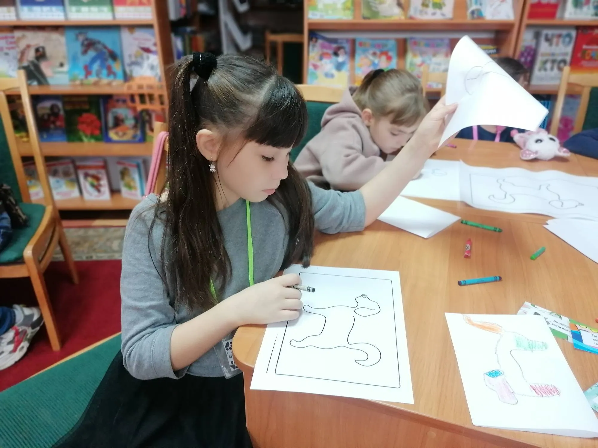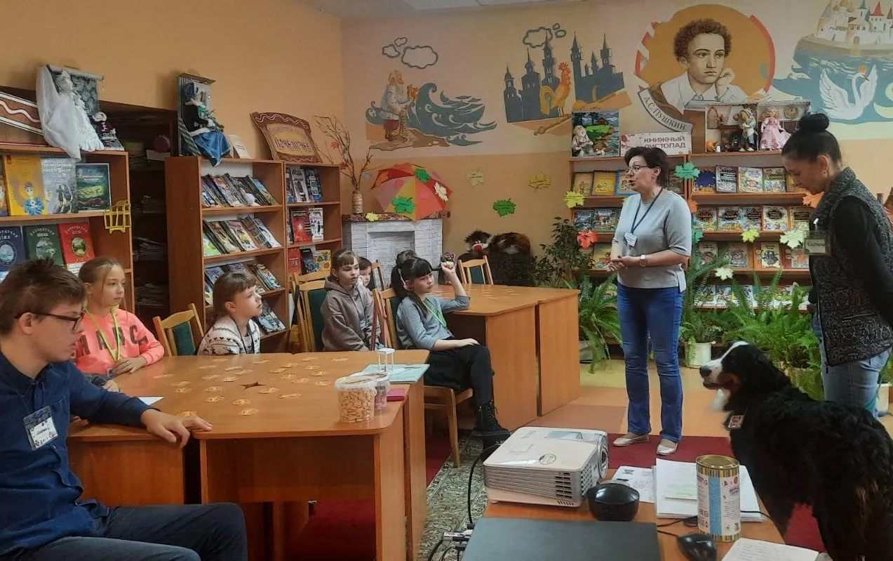 Но и ребята, ожидающие своей очереди чтения, тоже не грустят. Например, когда Фрося слушала книгу Лизы Папп «Мэйделин Финн и библиотечная собака», школьники повторяли правила поведения в библиотеке и общения с собакой, вспоминали все известные им породы, учились рисовать их, и при помощи игры «Весёлая азбука», проверяли свою интуицию.