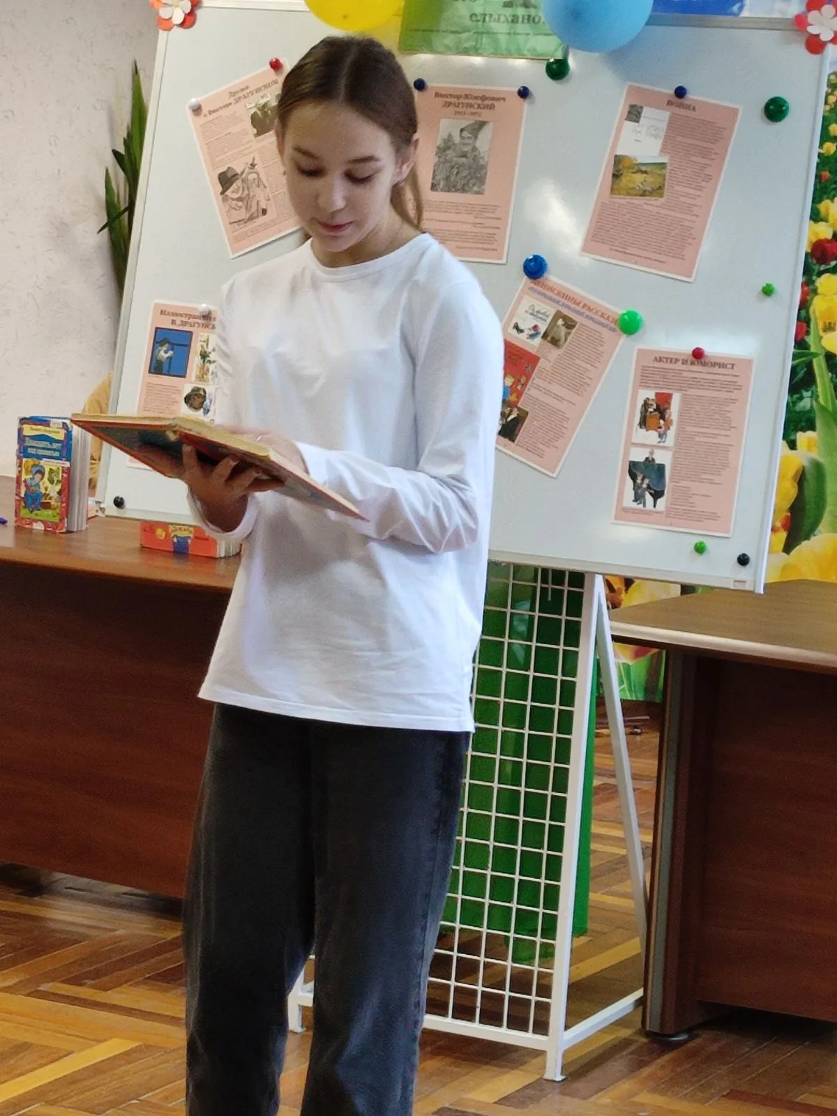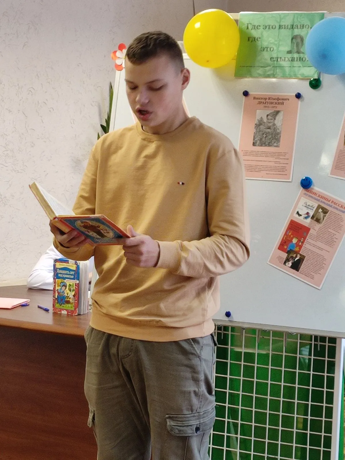Валерия Пилипенко, Елизавета Панько, Артём Масюк, Дарья Савьюк в рамках конкурса прочитали рассказы Виктора Драгунского. Победу в конкурсе одержал Артём Масюк.