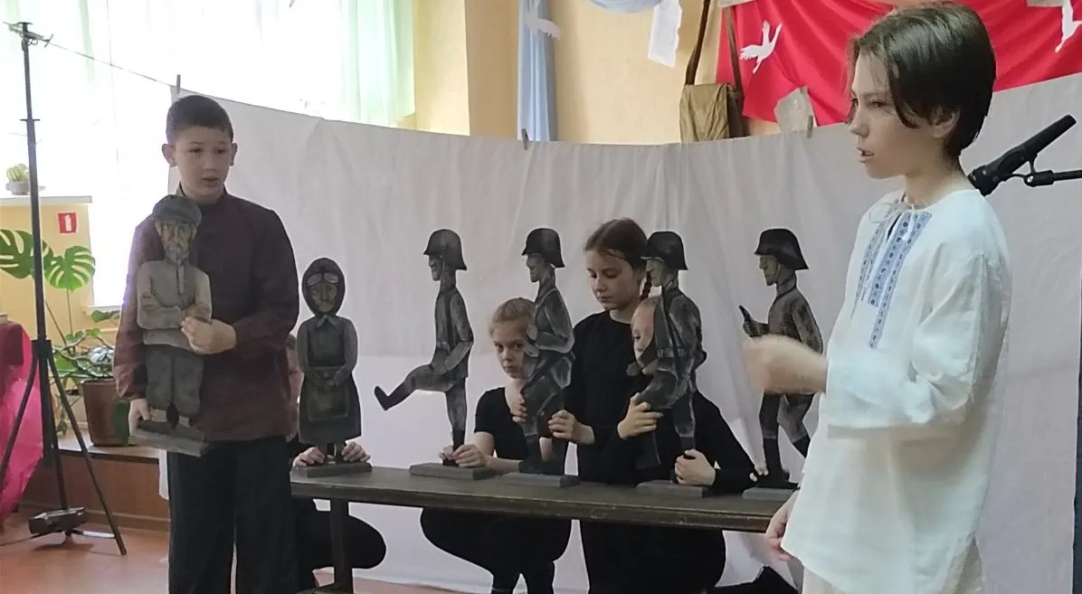 Юные артисты театральной студии под руководством Инны Николаевны Денисюк «Поколение-АРТ» Брестского кукольного театра рассказали истории, описанные в произведениях «Первый день настоящей войны» и «Платье в серый горошек» российского автора Елены Пономаренко.