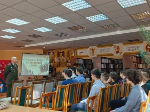 Накануне Дня защитников Отечества учащиеся колледжа связи встретились в Городской детской библиотеке с ветераном войны в Афганистане Сергеем Леонидовичем Журбенко.