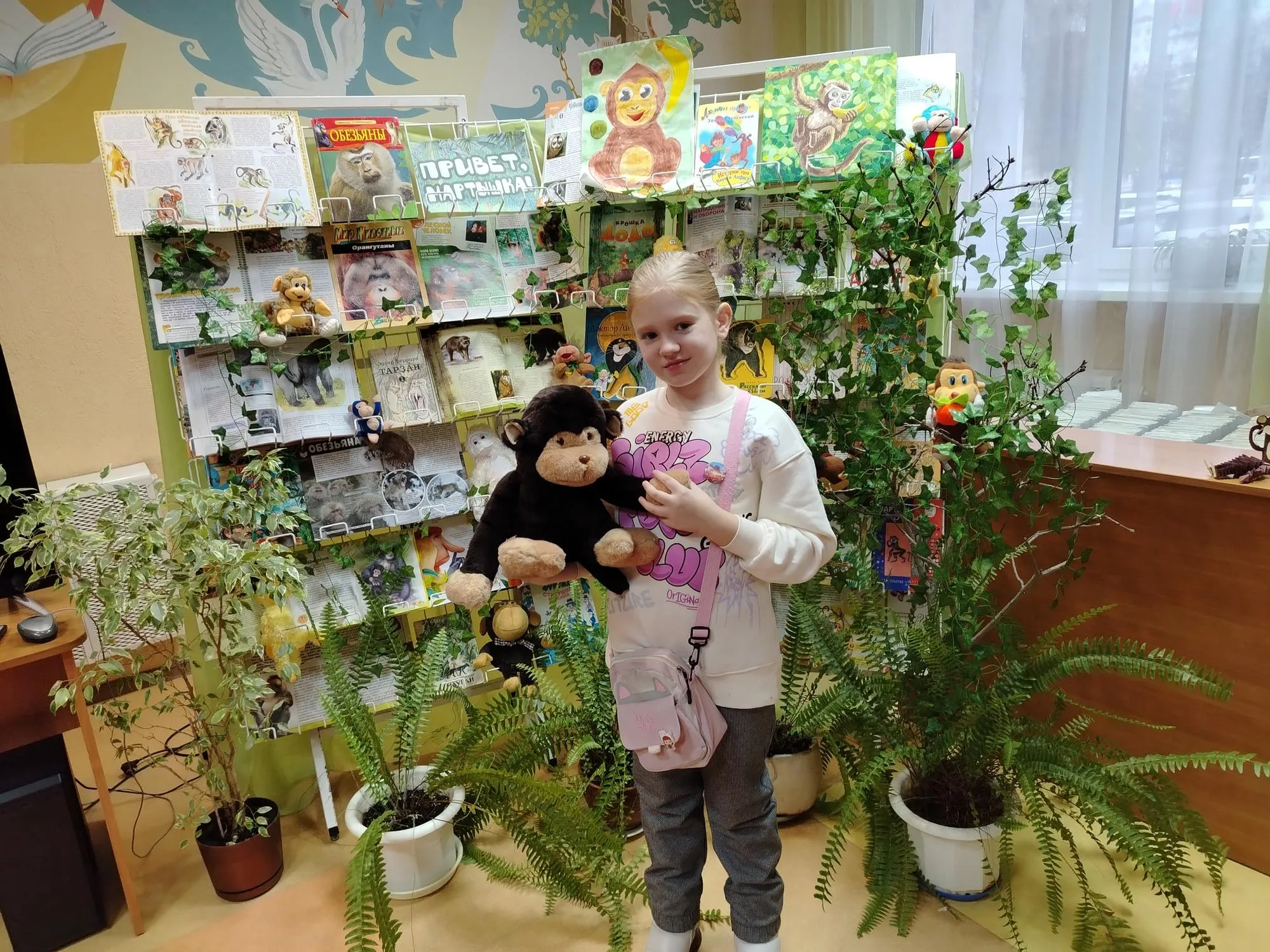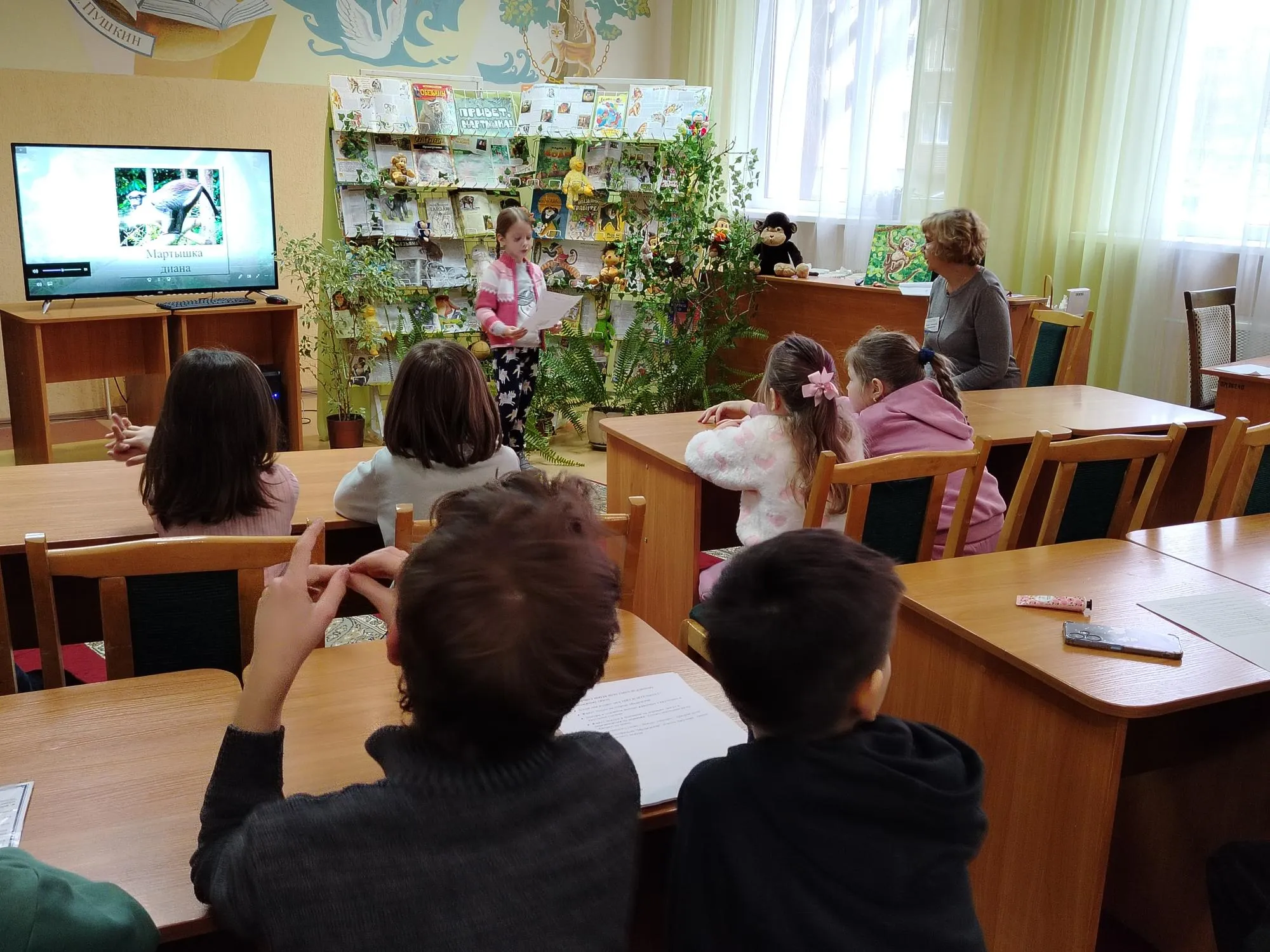 К встрече ребята готовились заранее. Они изучали информацию, узнавали интересные факты, создавали слайд-презентацию, чтобы потом рассказать друг другу о различных видах обезьян, таких как тамарины и капуцины, орангутаны и шимпанзе, карликовые игрунки и кошачьи лемуры, мандрилы и даже малоизвестном виде под названием «симпуна». Библиотекарь же дополнила рассказ детей удивительными сведениями о краснолицых макаках, которых также называют снежными обезьянами, а ещё о уакири и носачах. К слову, много интересного об этих забавных зверьках можно найти в журнале «Веселый зоопарк», книге «Обезьяны» и других изданиях, представленных на выставке «Привет, мартышка».