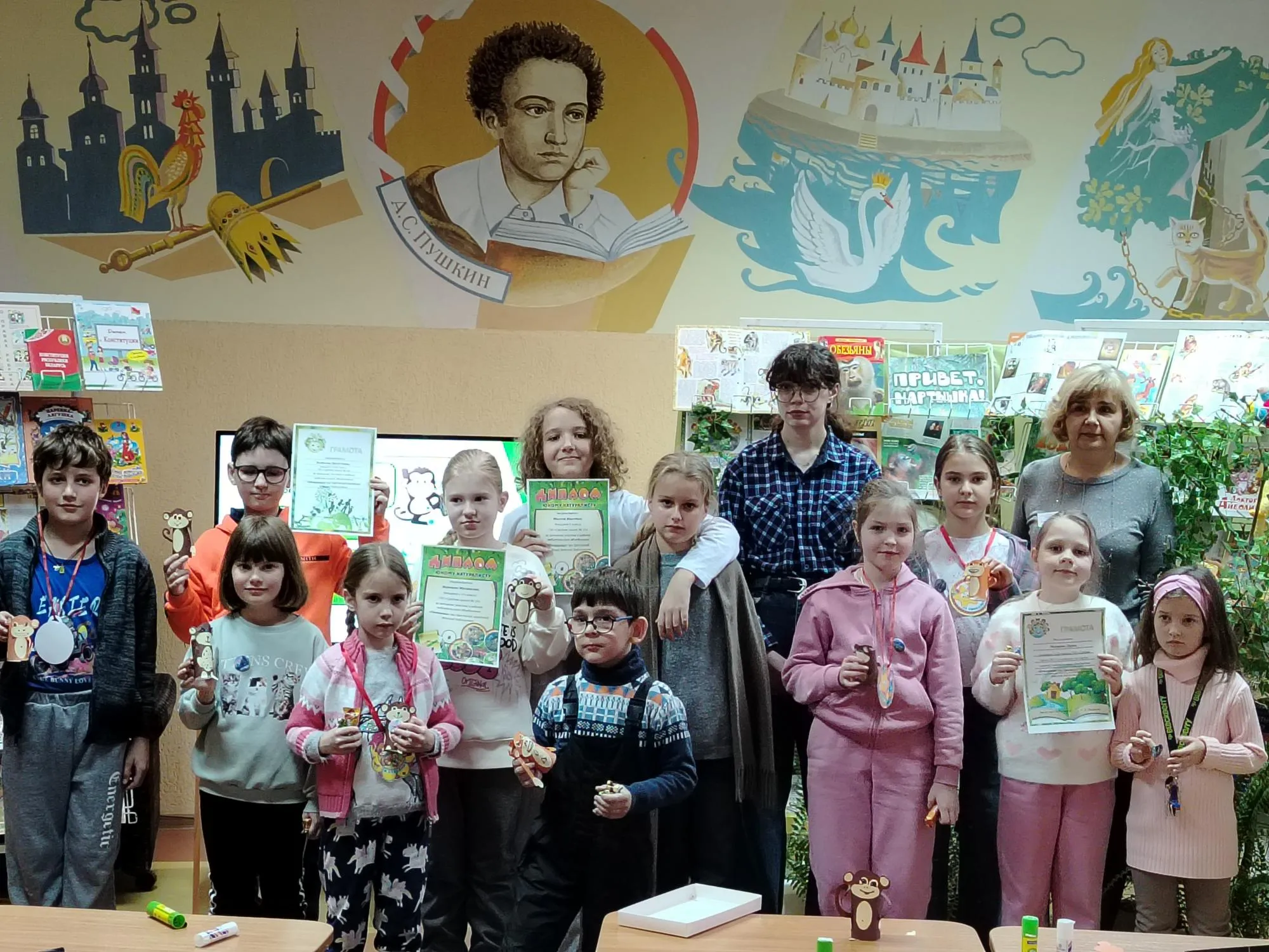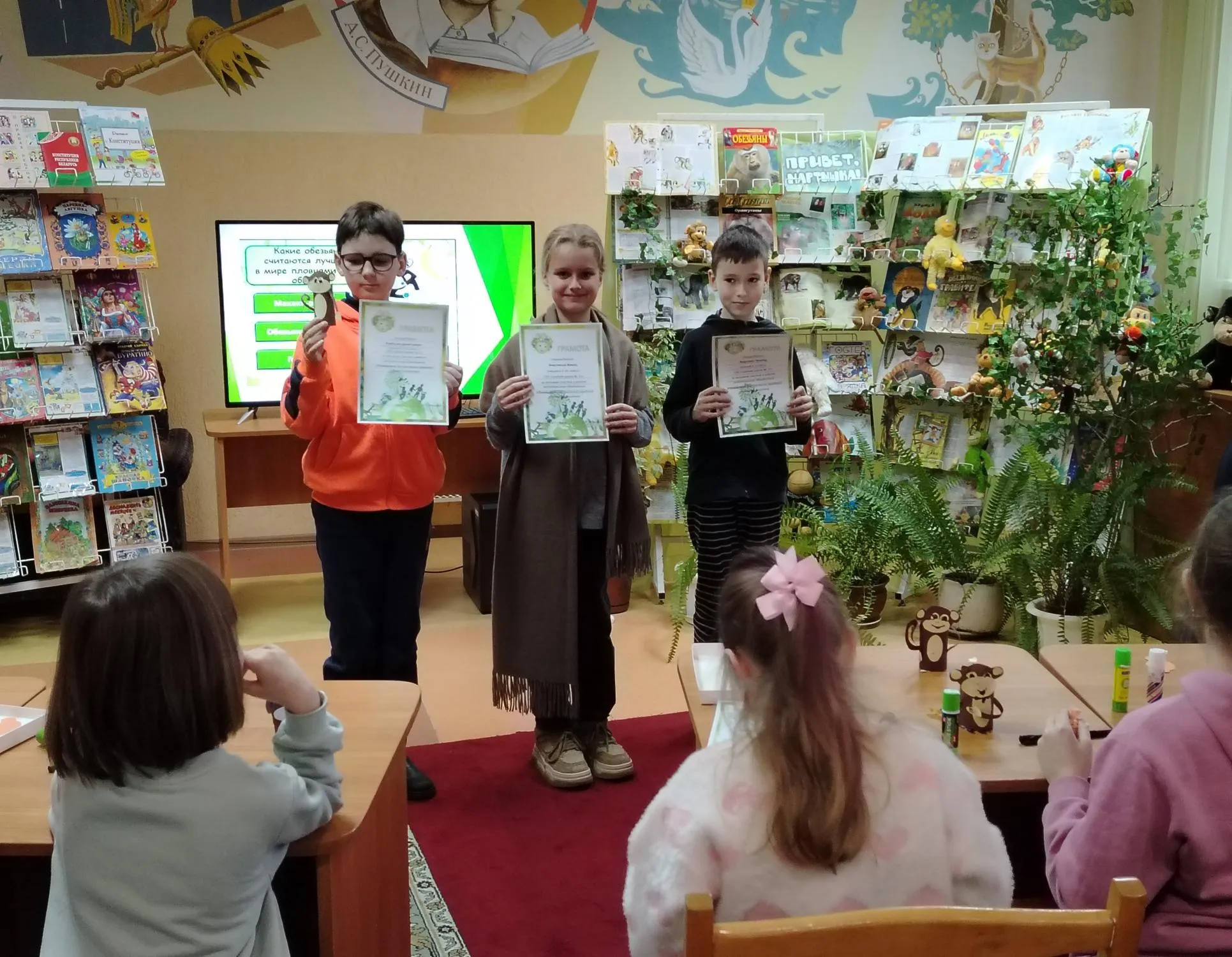 Еще больше информации участники узнали из теста «Вот какие обезьяны», а отвечая на вопросы викторины «Мартышкины книжки», вспомнили художественные произведения с этими персонажами. Среди них – «Про Веру и Анфису» Э. Успенского, «Пеппи Длинный чулок» А. Линдгрен, «Доктор Айболит» К. Чуковского, сказки Г. Остера и басни И. Крылова.