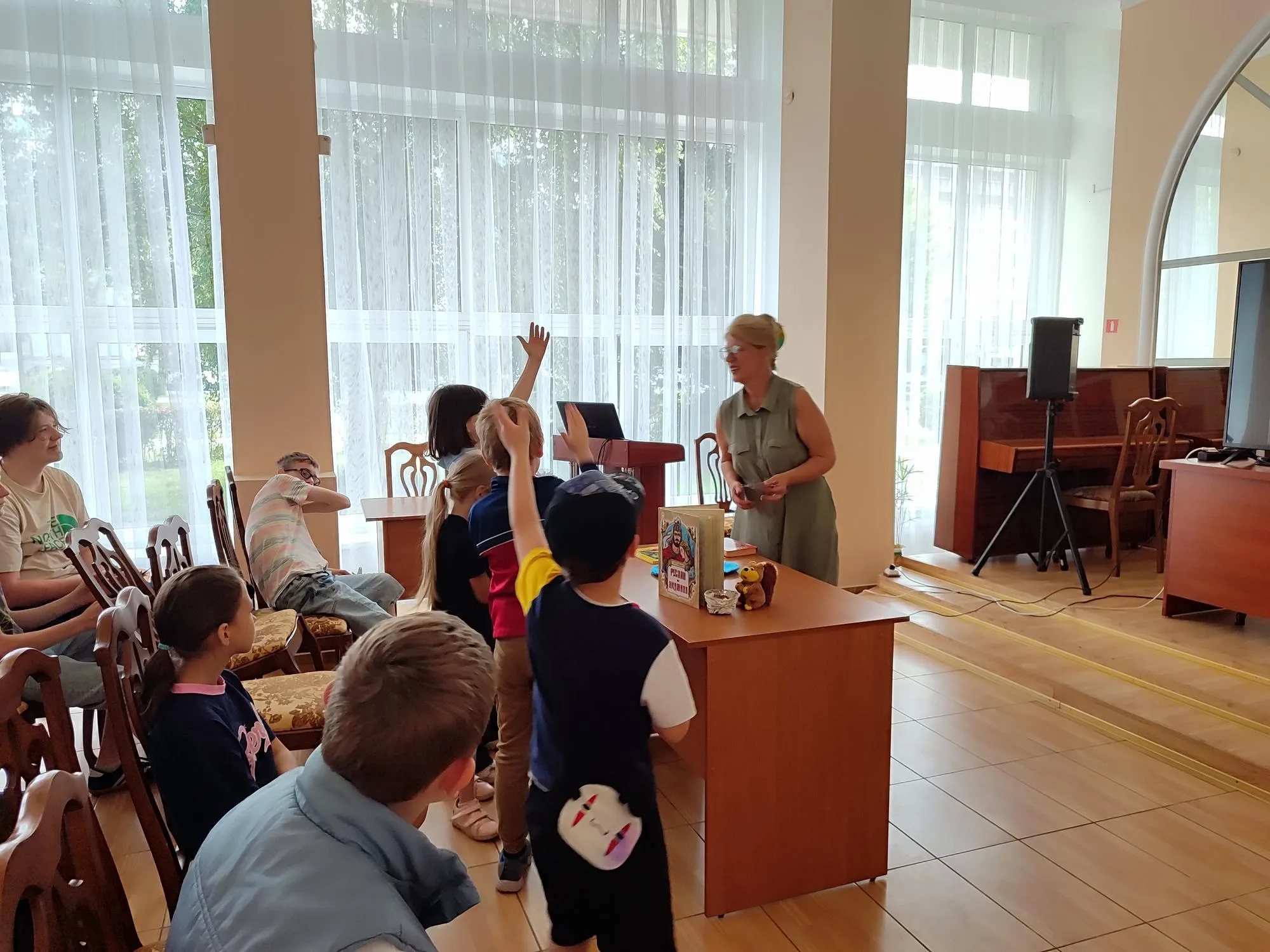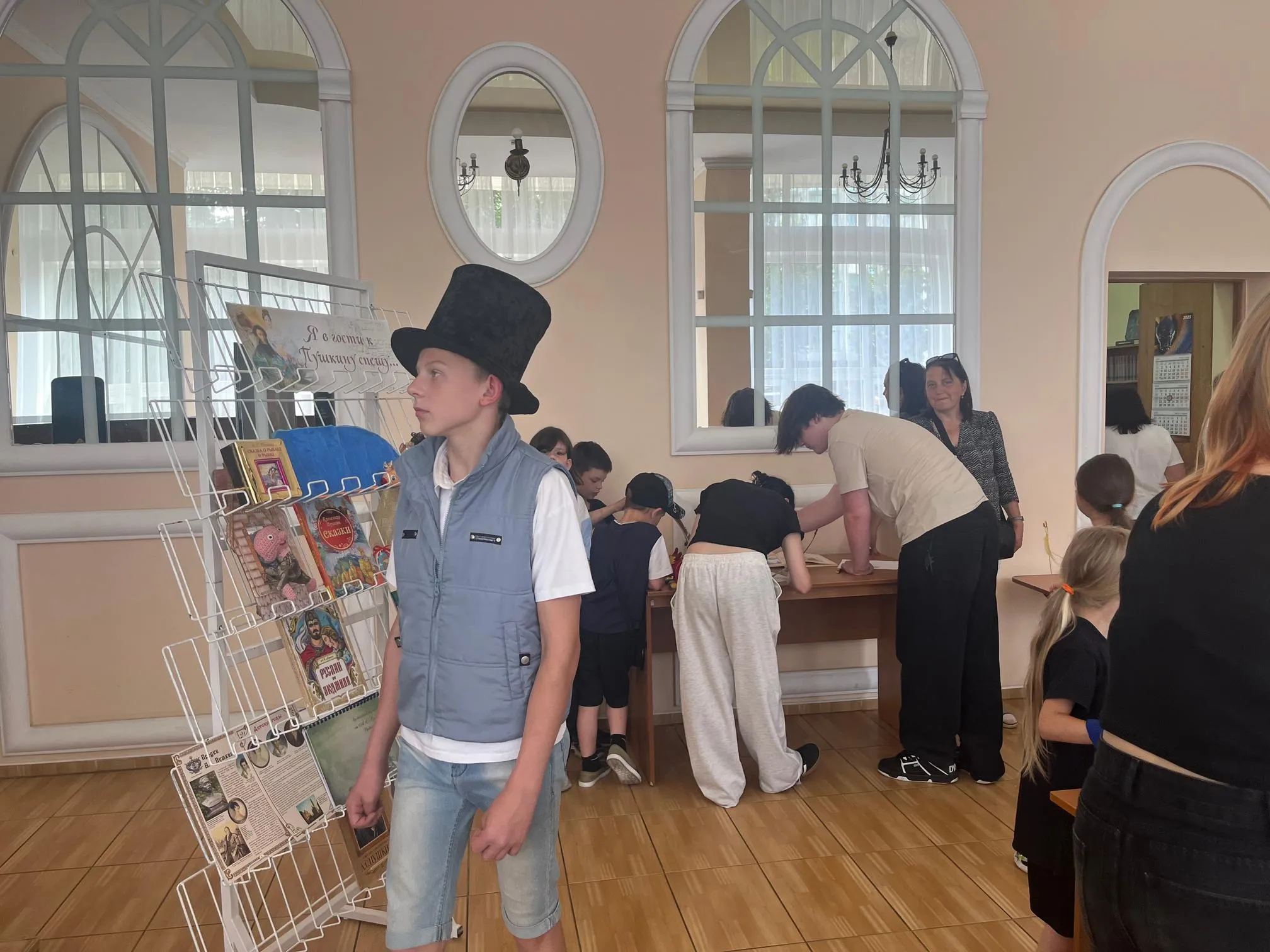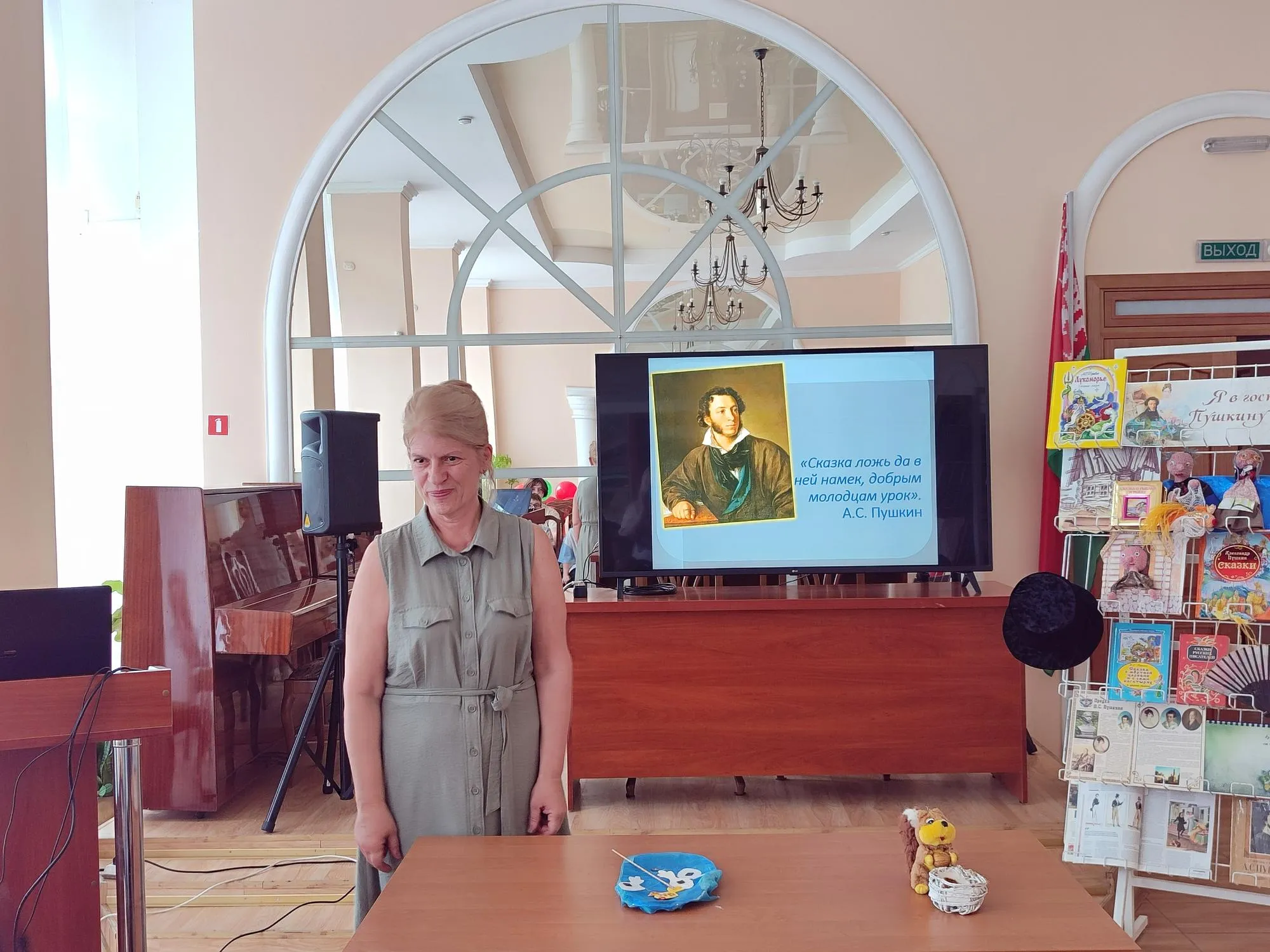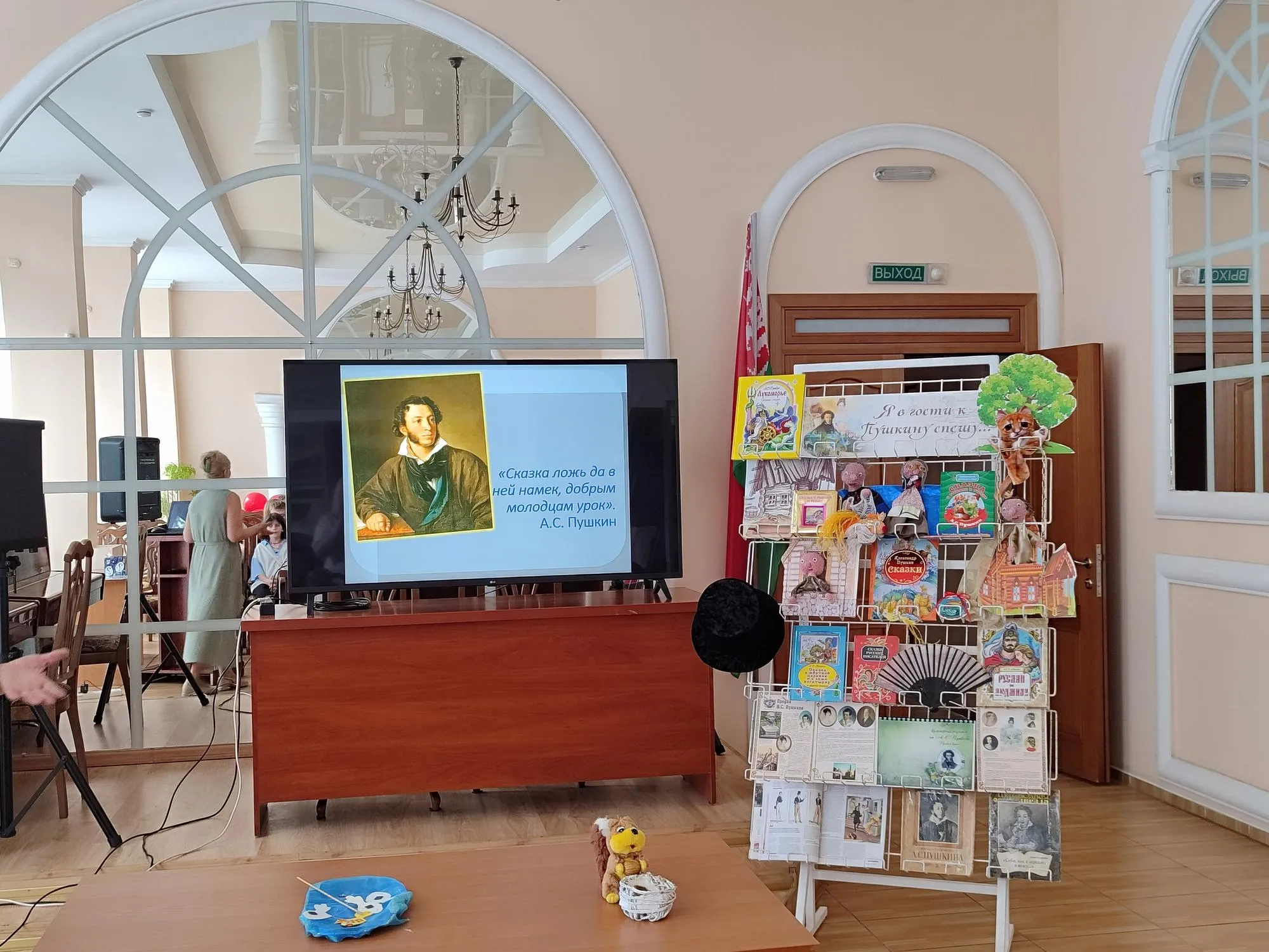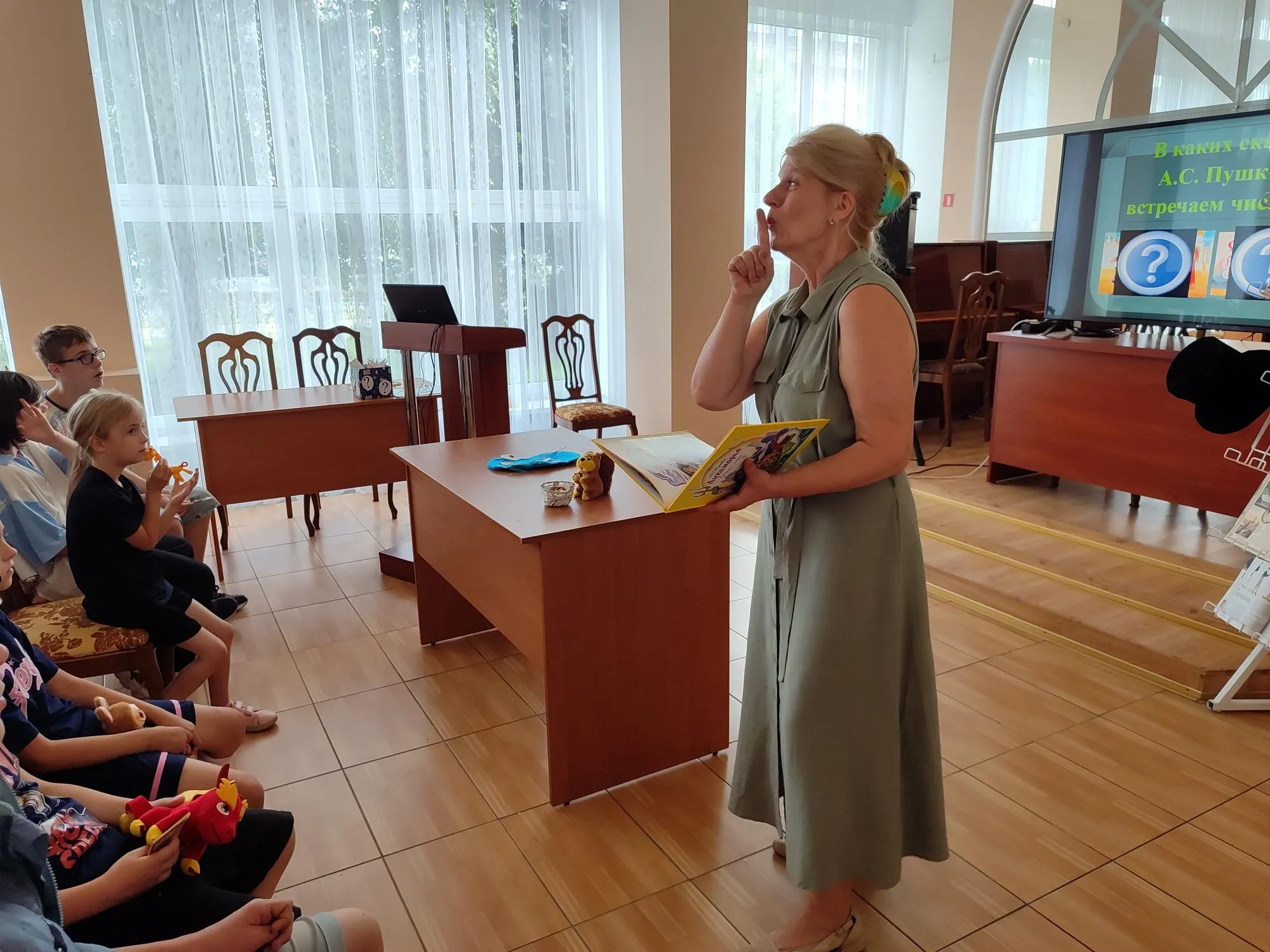 Продолжилось литературное путешествие в конференц-зале библиотеки. Ребята познакомились с биографией и творчеством А.С. Пушкина, кулинарными блюдами, одеждой и аксессуарами XIX века. Разделившись на две команды – «Золотой орех» и «Изумруд», ребята отвечали на вопросы викторины по сказкам А.С. Пушкина.
