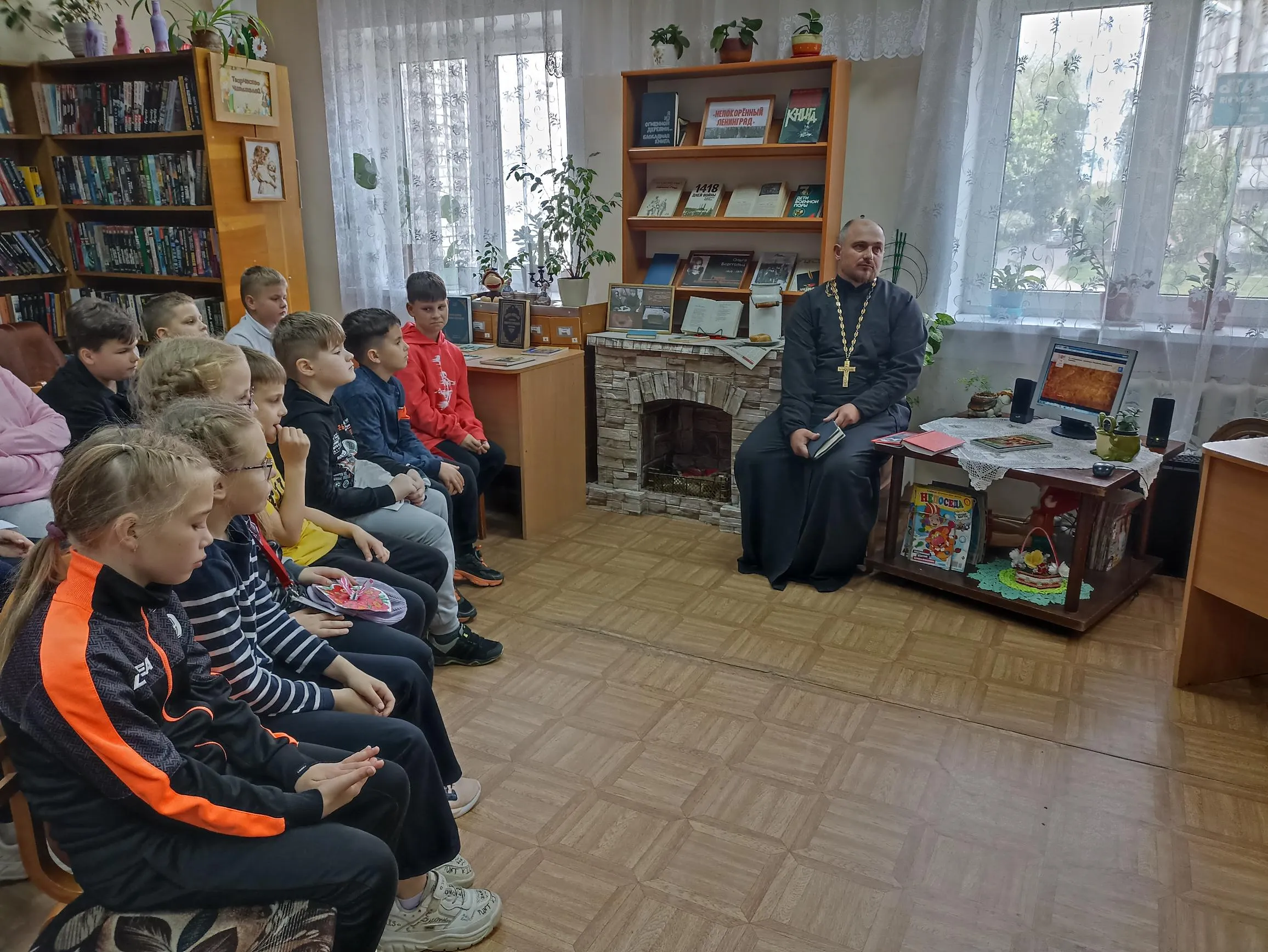 Беседа с отцом Евгением, настоятелем храма преподобных Александра Пересвета и Андрея Осляби воинско-пограничной части 2187, на тему «Священнослужители на войне» прошла в библиотеке-филиале № 9. Участниками мероприятия стали ребята средней школы № 5.