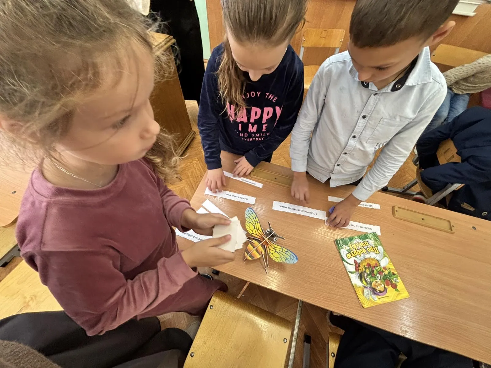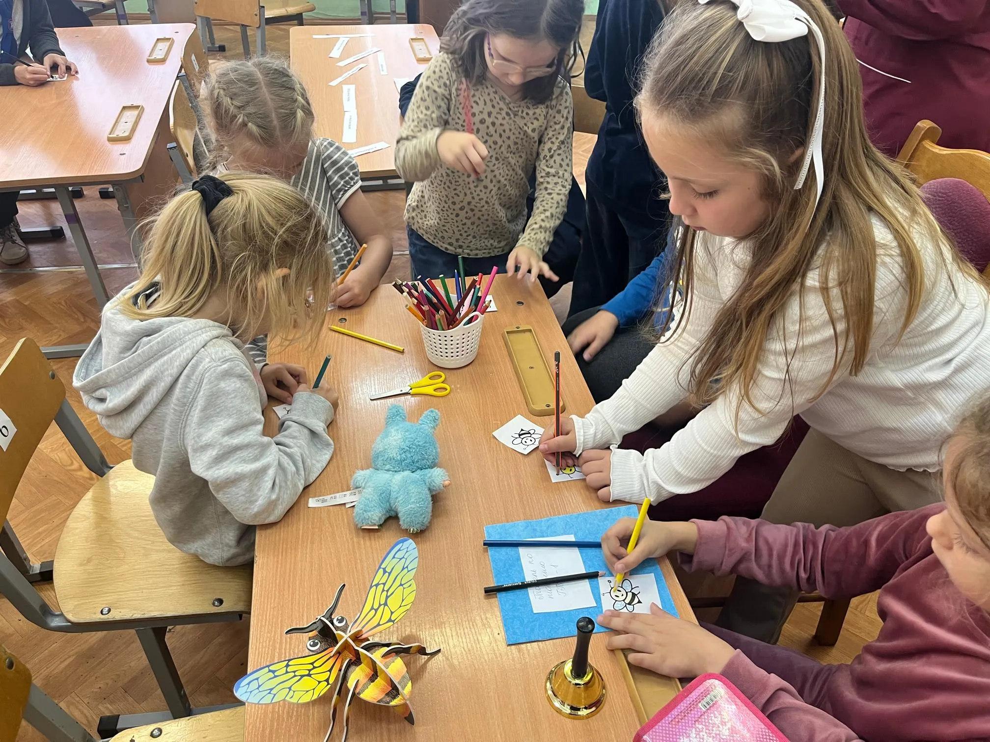 Но на этом задания не закончились! После обсуждения сказки ребята получили возможность проявить свои творческие способности. Они с увлечением раскрашивали ярких пчелок, стараясь сделать каждую особенной. Также юные читатели составляли пословицы о трудолюбии, разгадывали загадки, связанные с миром пчел и меда. Со всеми заданиями ребята прекрасно справились.