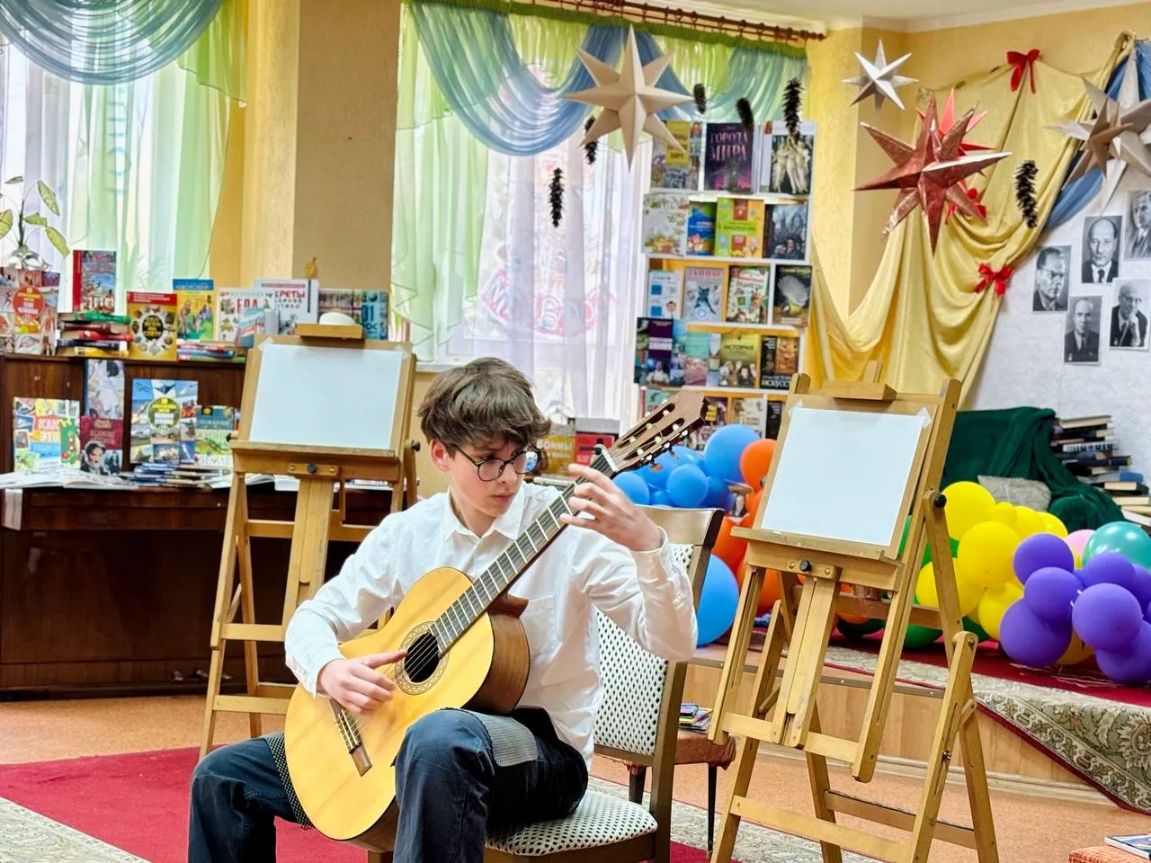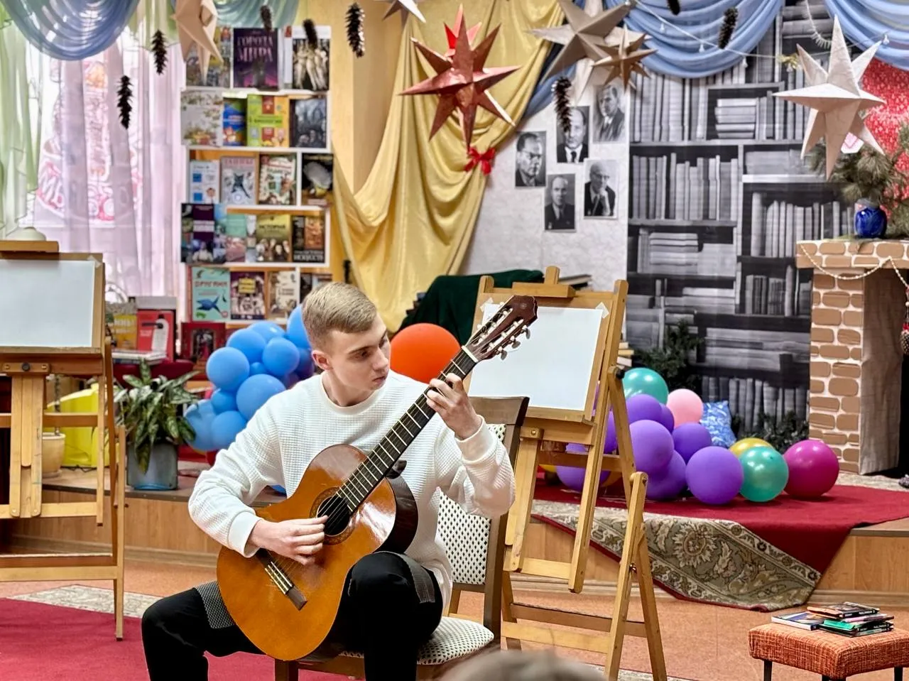 Открытие литературно-художественной выставки «В мире сказки» поддержали воспитанники музыкальной школы № 1 Иван Ильич и Антон Чернышов (класс гитары Юрия Монина).