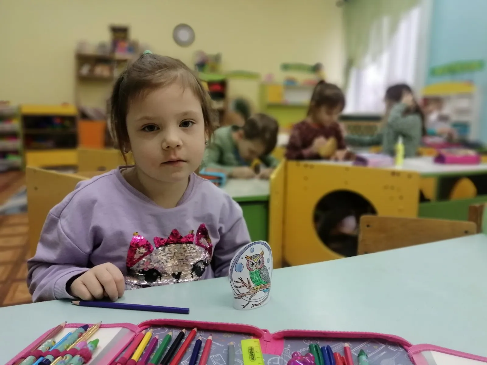 После обсуждения рассказа ребята выполняли разные задания: придумать имя и раскрасить сову. К слову, совы у ребят получились яркими, харизматичными и волшебными.