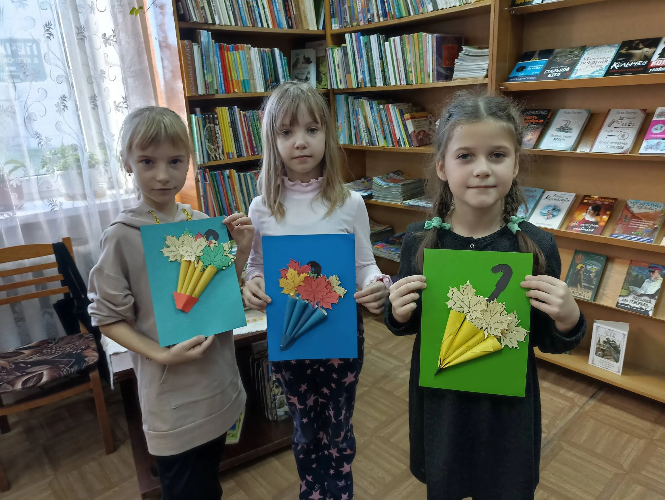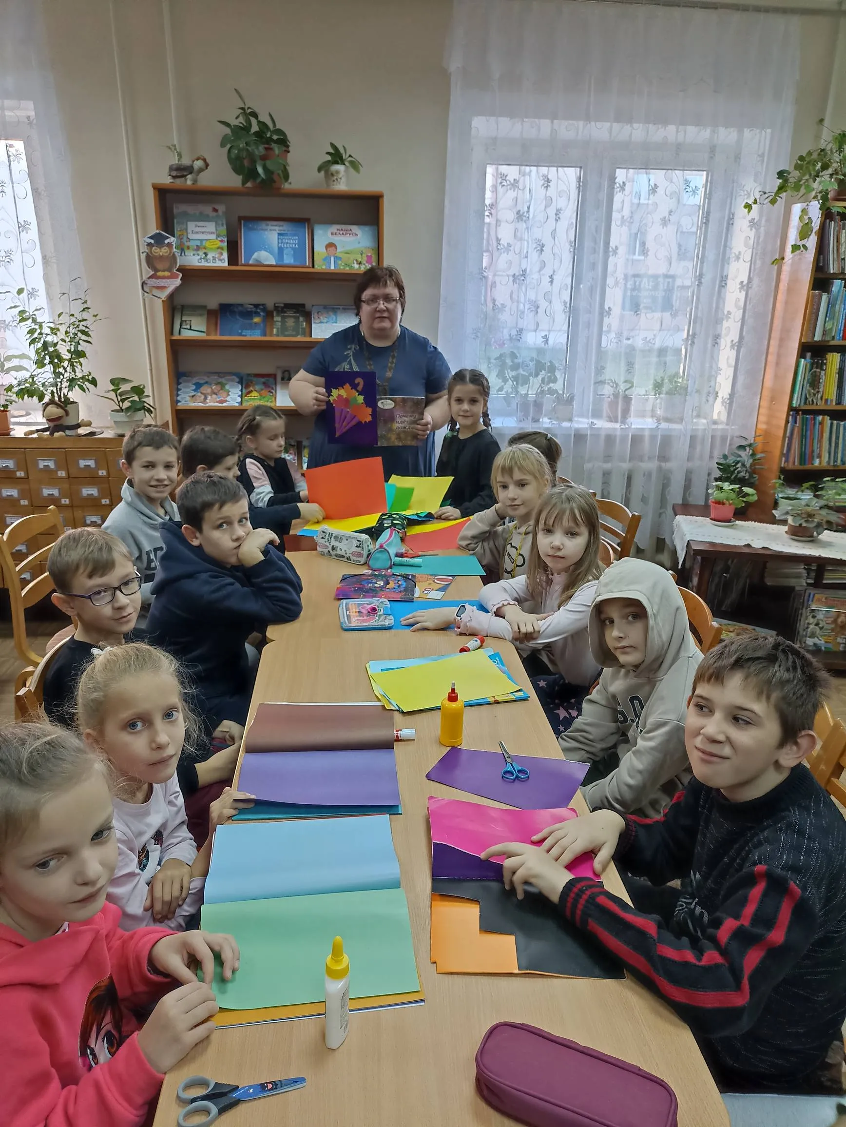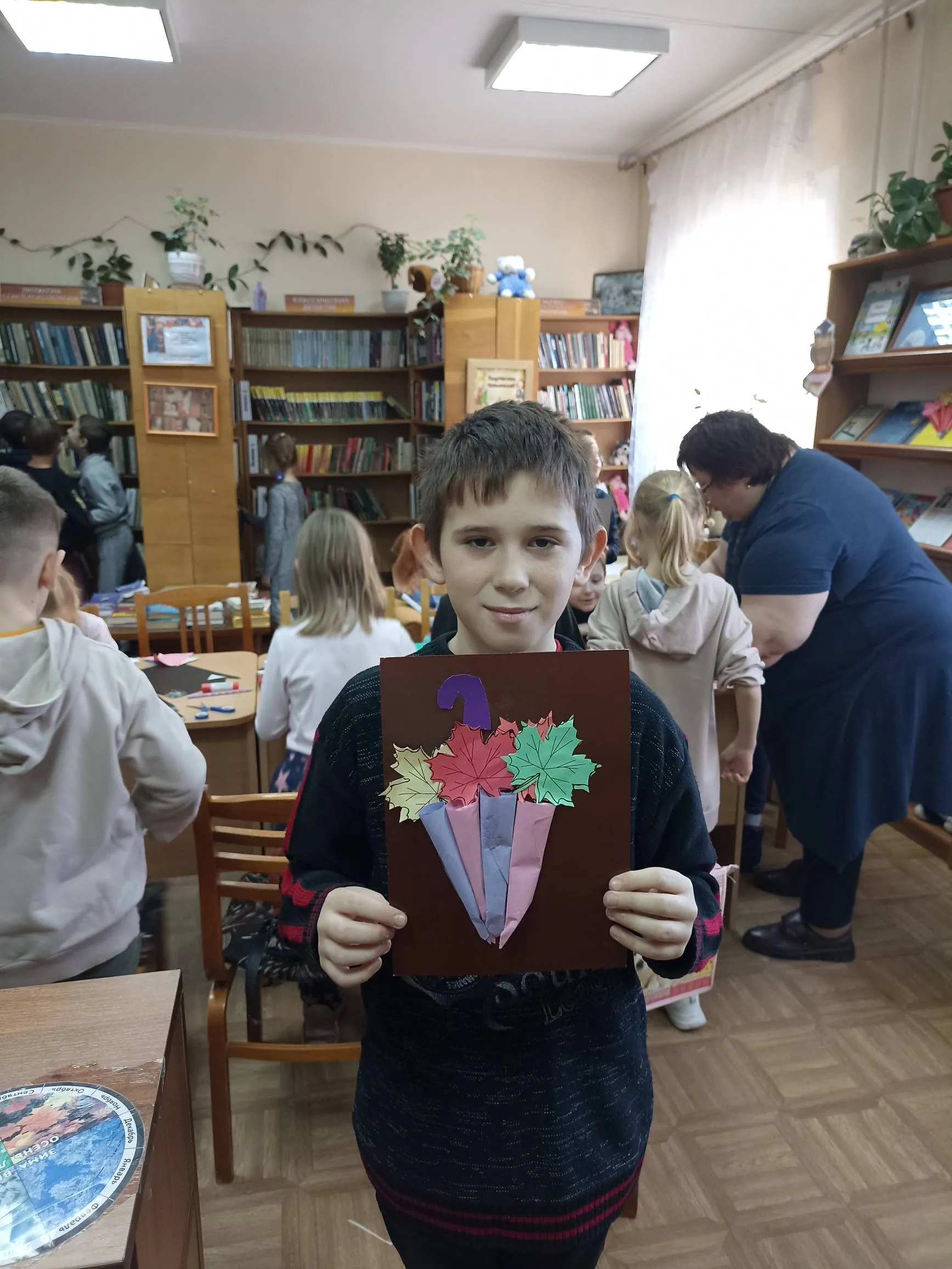 Однако в уютной библиотеке-филиале № 9 в один из ноябрьских дней было совсем не грустно. Здесь царила необыкновенно теплая душевная атмосфера. Для ребят провели познавательное и увлекательное мероприятие. Мальчишки и девчонки мастерили весьма актуальный для этой поры года аксессуар – разноцветный зонтик из цветной бумаги.