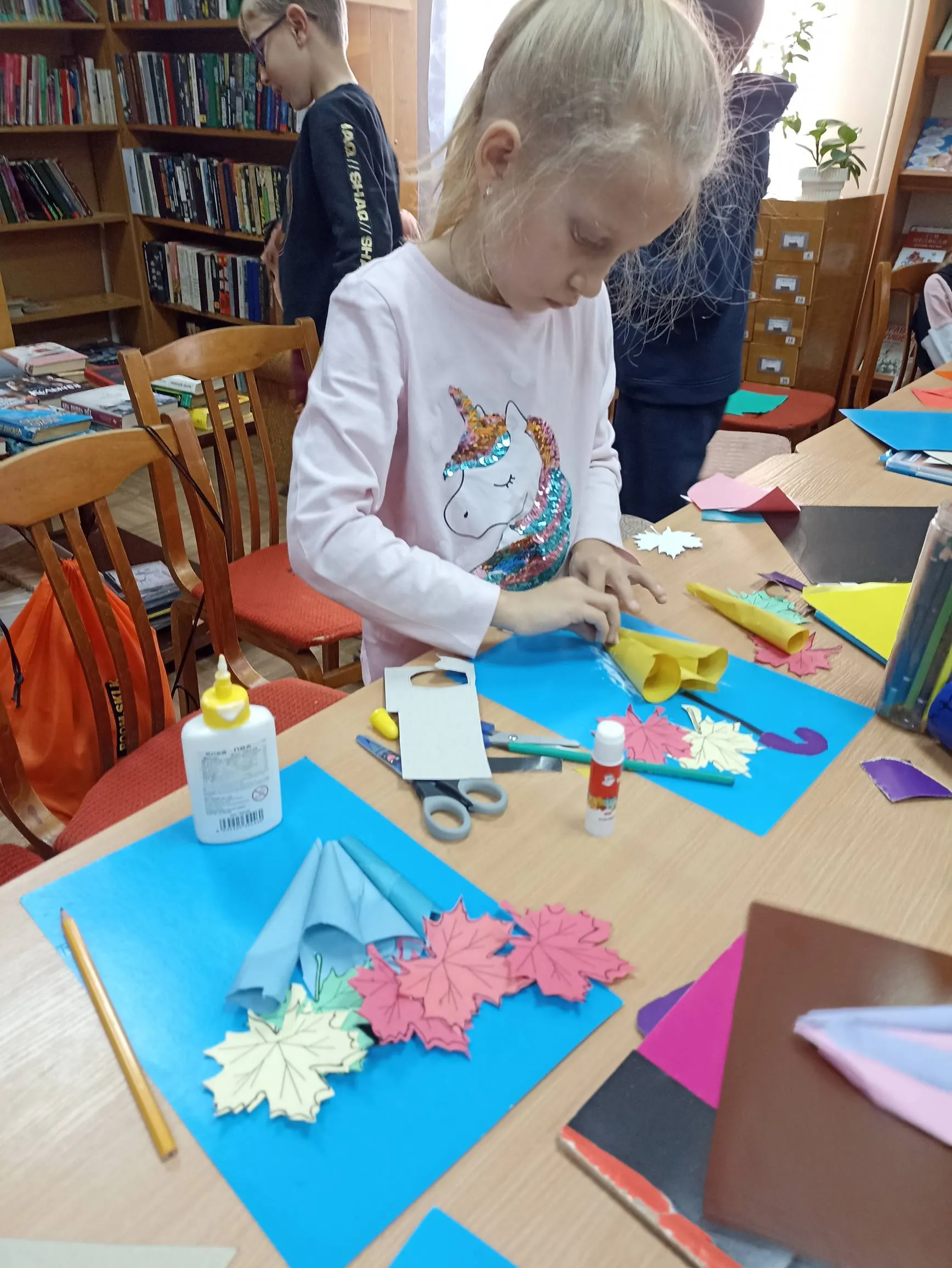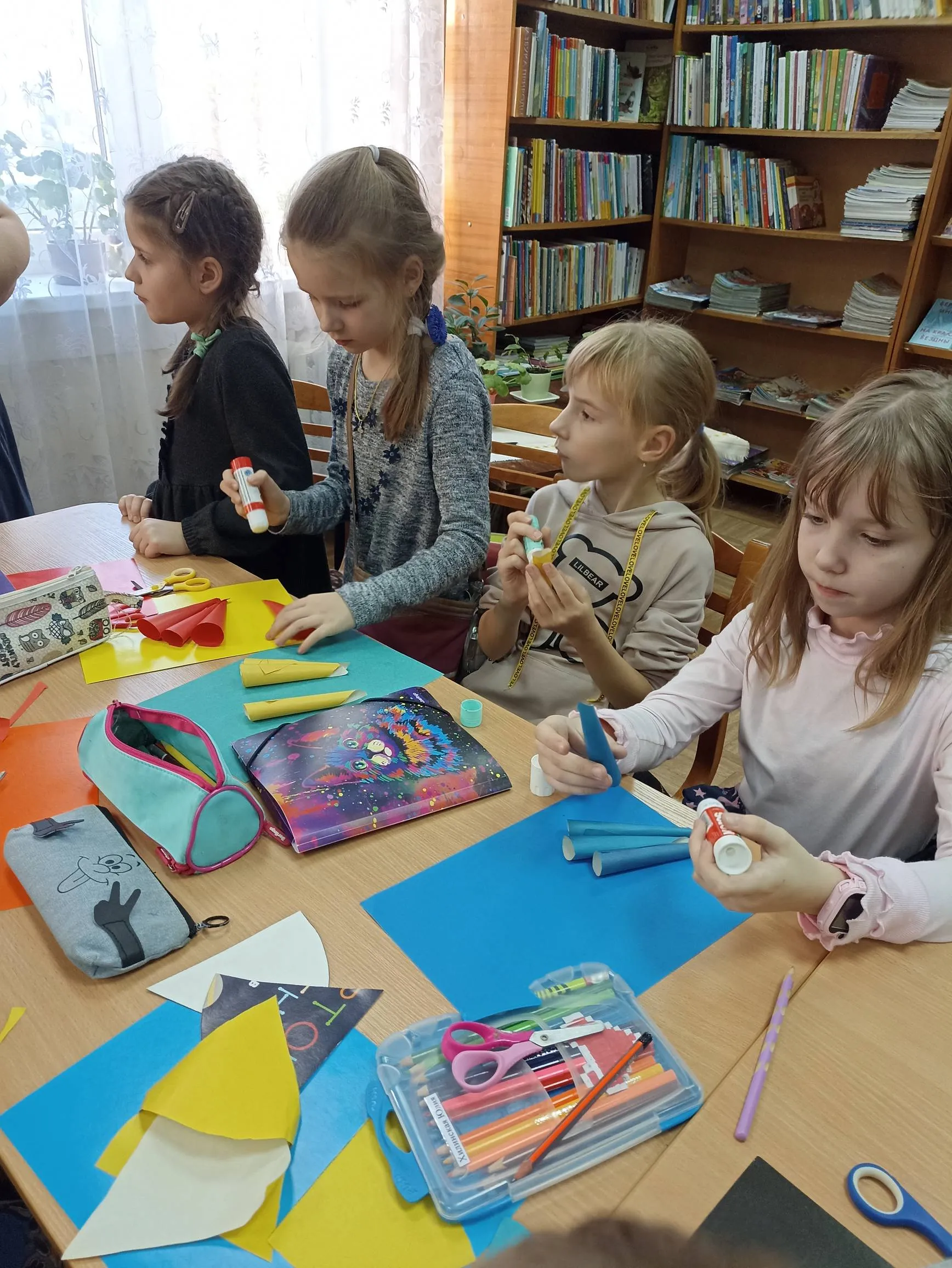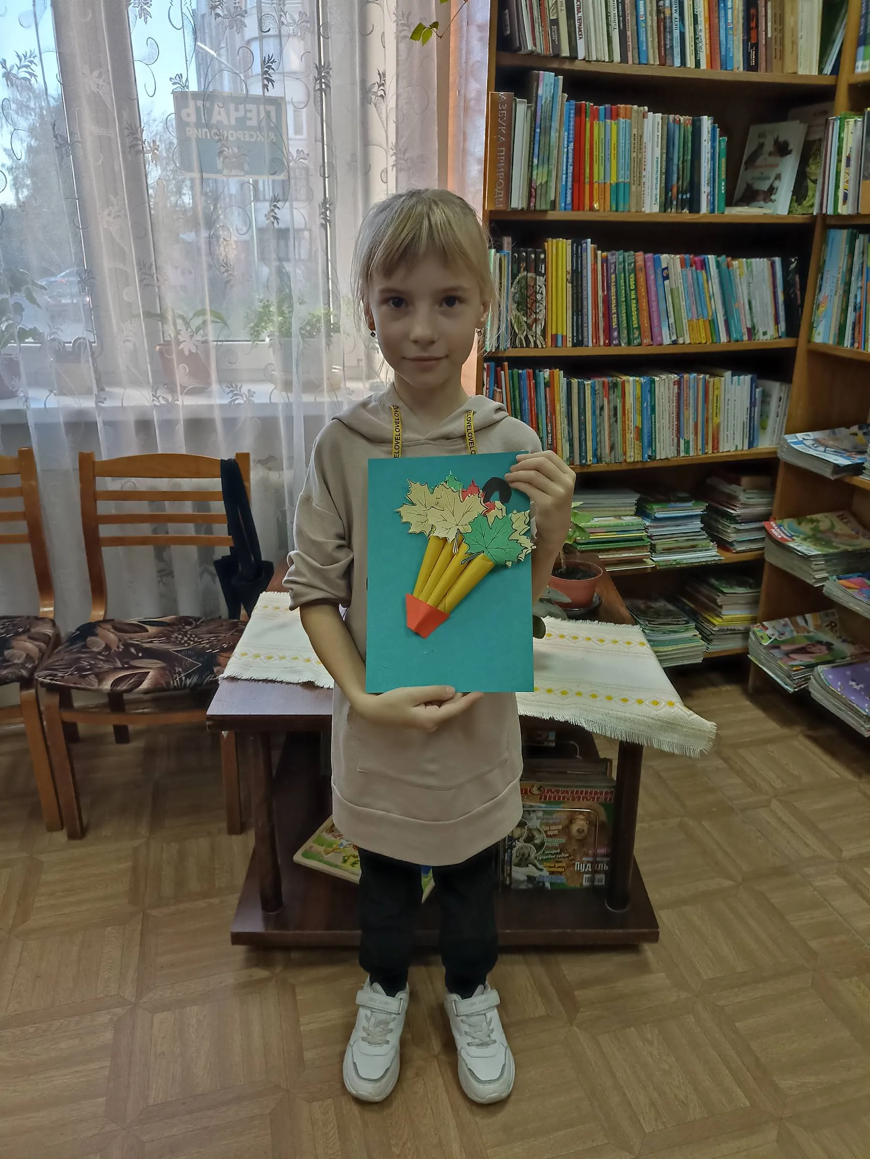 Однако в уютной библиотеке-филиале № 9 в один из ноябрьских дней было совсем не грустно. Здесь царила необыкновенно теплая душевная атмосфера. Для ребят провели познавательное и увлекательное мероприятие. Мальчишки и девчонки мастерили весьма актуальный для этой поры года аксессуар – разноцветный зонтик из цветной бумаги.