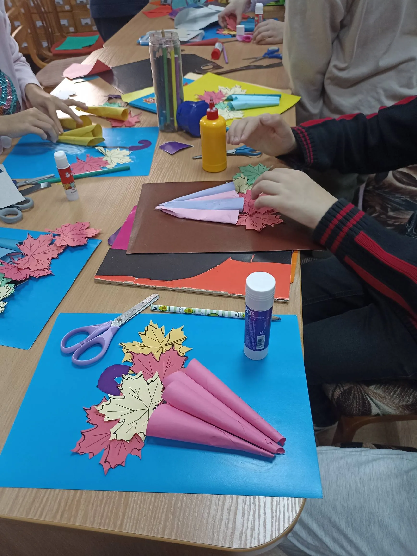 Как настоящие волшебники, своими руками они превращали картон и цветную бумагу в яркие поделки. Разноцветные зонтики, осенние летящие листочки, маленькие капельки дождя…